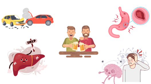 Lạm dụng đồ uống có cồn sẽ gây hại cho sức khỏe, các bệnh về gan, huyết áp, dạ dày, cũng như hệ thần kinh, gây tai nạn khi tham gia giao thông.