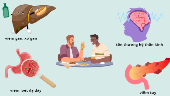 Việc lạm dụng đồ uống có cồn như rượu, bia … sẽ gây ảnh hưởng nghiêm trọng tới sức khoẻ con người như tổn thương hệ thần kinh, rối loạn tâm thần, viêm gan, xơ gan, viêm loét dạ dày, viêm tuỵ, …