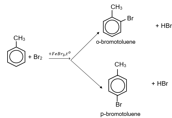 Toluene phản ứng nhanh hơn benzene trong điều kiện tương tự tạo hỗn hợp sản phẩm chính (đồng phân ortho và para)
