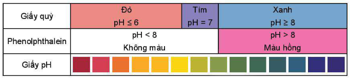 Chất chỉ thị acid – base là chất có màu sắc biến đổi phụ thuộc vào giá trị pH của dung dịch. Một số chất chỉ thị như giấy pH, giấy qùy. Phenolphthalein có màu sắc thay đổi trong các khoảng pH khác nhau.