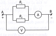 Cho sơ đồ đoạn mạch điện như hình bên. Biết R1 = 80 Ω, R2 = 60 Ω và số chỉ của vôn kế là 24 V. Số chỉ của ampe kế là