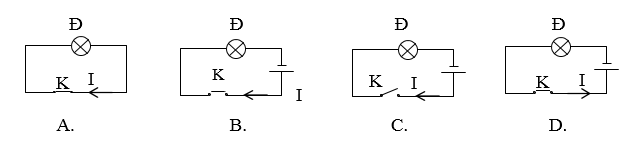 Trong các sơ đồ mạch điện dưới đây, sơ đồ mạch điện có đèn sáng và chiều dòng điện đúng là: