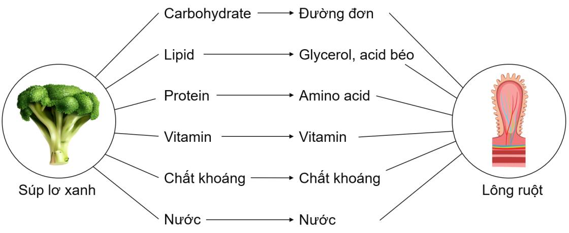 - Các chất này đi qua niêm mạc ruột non vào mao mạch máu và mao mạch bạch huyết trong lông ruột, theo hệ tuần hoàn đi nuôi dưỡng tất cả các tế bào trong cơ thể.