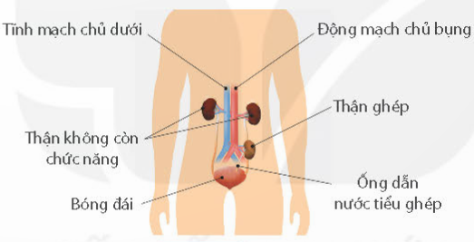 + Quá trình ghép thận bao gồm ghép tĩnh mạch chủ dưới và động mạch chủ bụng, thận không còn chức năng và ống dẫn nước tiểu ghép vào.