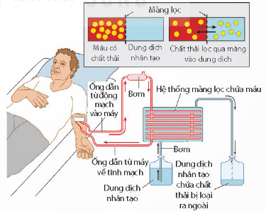 Quá trình chạy thận nhân tạo bao gồm hệ thống màng lọc chứa máu, dung dịch nhân tạo chứa chất thải bị loại ra ngoài, ống dẫn từ máy về tính mạch và bom.