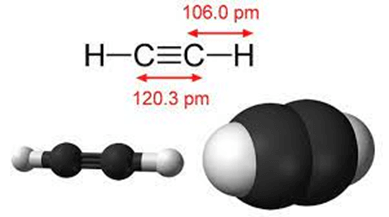 Phân tử acetylene (C2H2) có 2 nguyên tử carbon và 2 nguyên tử hydrogen nằm trên một đường thẳng, góc liên kết CCH là 180°. Liên kết ba C≡C bao gồm một liên kết Ϭ và hai liên kết π.