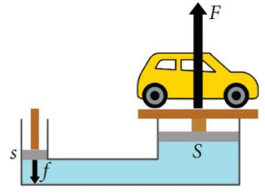 Hình bên dưới là một máy nén thủy lực được dùng để nâng ô tô trong gara. Muốn có một lực nâng là 10 000 N tác dụng lên pit-tông lớn, thì phải tác dụng lên pit-tông nhỏ một lực bằng bao nhiêu?