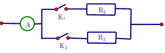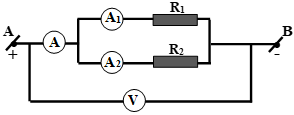 Cho mạch điện có sơ đồ như hình bên trong đó điện trở R1 = 15 Ω, R2 = 10 Ω. Ampe kế A1 chỉ 0,5 A. Số chỉ của vôn kế và ampe kế A lần lượt là: