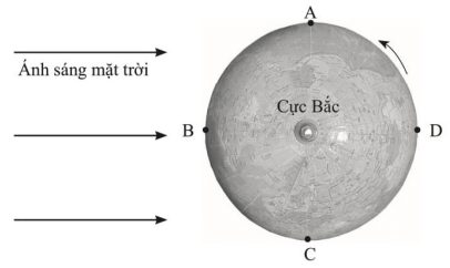 Ở vị trí D đang là ban đêm. Vì ta thấy ở vị trí này không nhận được ánh sáng từ Mặt Trời chiếu tới.