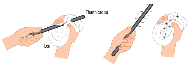 Khi hai vật liệu cách điện cọ xát vào nhau, như thanh cao su cọt xát ào len, các electron từ len dịch chuyển sang thanh cao su và len bị nhiêm điện trái dấu.