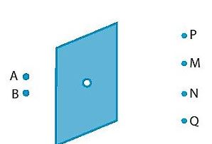 Một mục tiêu di động giữa A và B ở bên kia một bức tường, trên bức tường có một lỗ thủng nhỏ hình bên dưới. Ở bên này bức tường, quan sát viên cần phải đặt mắt quan sát trong khoảng nào để nhìn thấy mục tiêu?
