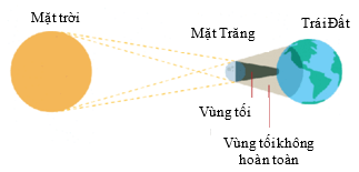 Quan sát hình dưới và cho biết, đứng trên Trái Đất, ở chỗ vùng tối, không nhìn thấy Mặt Trời, tại đó ta quan sát được hiện tượng gì?