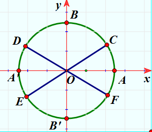 , E và D lần lượt là các điểm đối xứng của C và F qua gốc O. Nghiệm của phương trình  được biểu diễn trên đường tròn lượng giác là những điểm nào?