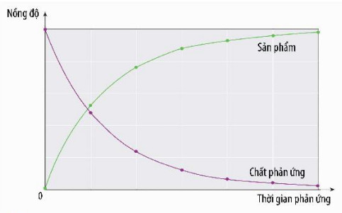 Hình 1. Đồ thị biểu diễn sự thay đổi nồng độ chất phản ứng nồng độ của chất phản ứng và (màu tím) và sản phẩm (màu xanh) theo thời gian