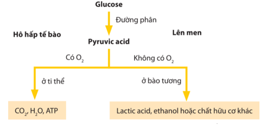 + Giai đoạn lên men: Pyruvic acid được giữ lại ở bào tương và được chuyển hóa thành lactic acid, ethanol hoặc hợp chất hữu cơ khác theo con đường lên men.