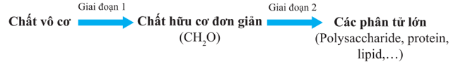 + Giai đoạn 1: Tổng hợp chất hữu cơ đơn giản từ các chất vô cơ. Giai đoạn này được thực hiện thông qua các quá trình như quang tổng hợp, hoá tổng hợp, quang khử.