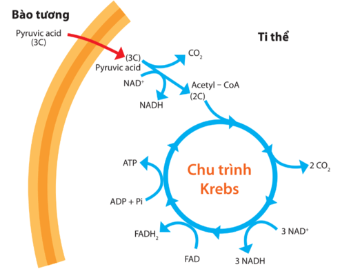 + Pyruvic acid được hình thành trong bào tương được chuyển qua lớp màng kép vào chất nền ti thể. Tại đây, 2 phân tử pyruvic acid sẽ được chuyển hóa thành 2 phân tử acetyl – CoA, đồng thời giải phóng 2 phân tử CO2 và 2 NADH.