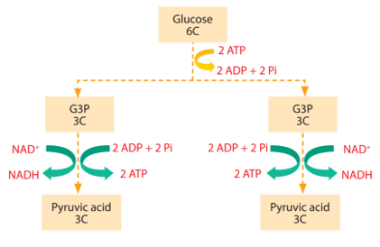Glucose + 2 ADP + 2 Pi + 2 NAD+ → 2 pyruvic acid + 2 ATP + 2 NADH