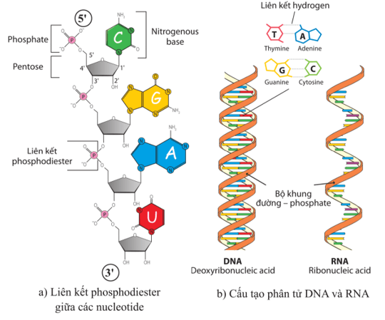 - Các nucleotide kết hợp với nhau qua liên kết phosphodiester được hình thành giữa đường pentose của nucleotide này với gốc phosphate của nucleotide kế tiếp tạo nên chuỗi polynucleotide.