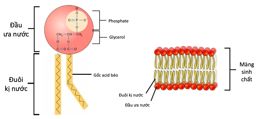 - Phân tử phospholipid gồm một đầu ưa nước (chưa gốc phosphate liên kết với một gốc ưa nước) và hai đuôi kị nước.