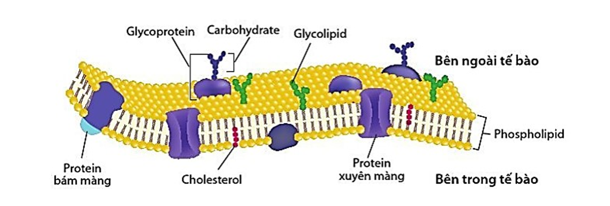 + Các phân tử protein: có sự sắp xếp khác nhau "khảm" trên lớp kép phospholipid, có phân tử xuyên qua lớp phospholipid (protein xuyên màng), có phân tử chỉ bám vào phân tử protein khác (protein bám màng hoặc protein rìa màng).