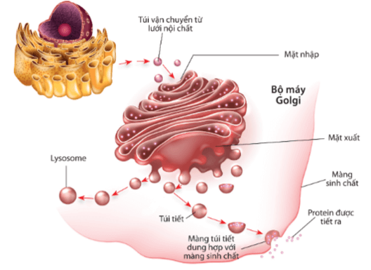 + Sửa đổi, phân loại, đóng gói, vận chuyển các sản phẩm từ lưới nội chất: Lưới nội chất tổng hợp các chất như protein, lipid, carbohydrate được vận chuyển trong các túi nhỏ hình cầu (túi vận chuyển) đến bộ máy Golgi. Tại bộ máy Golgi, các sản phẩm tổng hợp từ lưới nội chất được sửa đổi, phân loại và đóng gói rồi vận chuyển đến các bào quan hay màng tế bào.