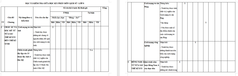 Mẫu ma trận và bảng đặc tả đề thi giữa kì 1 môn Lịch sử 8 sách Cánh diều