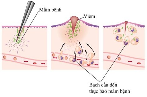 - Nếu mầm bệnh vào cơ thể thì cơ thể tiêu diệt mầm bệnh bằng một số cách như thực bào, tạo ổ viêm, sinh kháng thể.