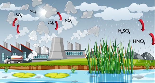 - Quá trình hình thành: do sự oxi hóa SO2 và NOx với xúc tác của các ion kim loại trong khói, bụi,...Các khí này hòa tan trong nước tạo thành dung dịch H2SO4 và dung dịch HNO3.