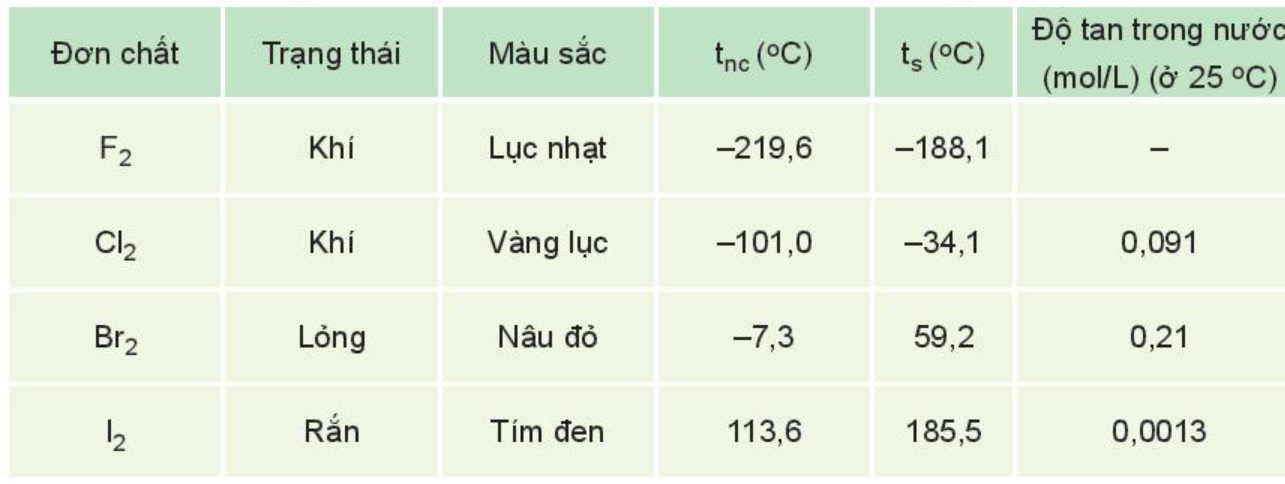 Trạng thái tồn tại, màu sắc, nhiệt độ nóng chảy (tnc), nhiệt độ sôi (ts) của halogen được trình bày ở Bảng 1: