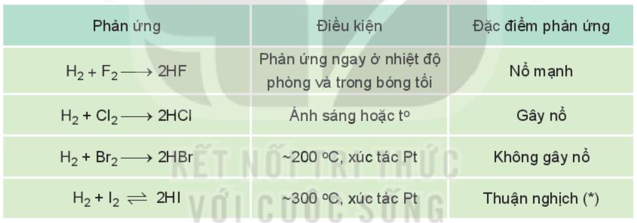 Bảng 2: Một số đặc điểm của phản ứng giữa halogen và hydrogen