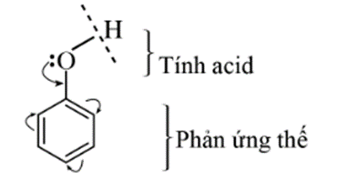 Trong phân tử phenol, nhóm –OH liên kết trực tiếp với vòng benzene. Nhờ đó, vòng benzene trở thành nhóm hút electron, làm giảm mật độ electron ở nguyên tử oxygen và tăng sự phân cực của liên kết O–H, đồng thời tăng mật độ electron trong vòng benzene.