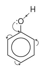 Phenol có nhóm phenyl hút electron, làm giảm mật độ electron ở nguyên tử oxygen, dẫn đến tăng sự phân cực của liên kết O-H đồng thời làm tăng mật độ electron trong vòng benzene, đặc biệt ở vị trí o,p.
