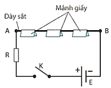 Thực hiện thí nghiệm với nguồn điện 9V, công tắc K, sợi dây sắt AB, vài mảnh giấy và điện trở R như hình dưới đây để tìm hiểu về tác dụng nhiệt của dòng điện.