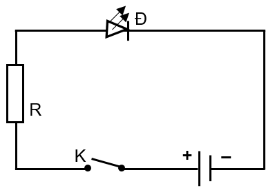 Lắp mạch điện như hình sao cho bản cực nhỏ của đèn với cực dương của nguồn điện và bản kim loại lớn hơn được nối với cực âm, ta thấy đèn LED sáng. Khi đảo ngược hai đầu dây đèn LED, đóng công tắc ta thấy đèn không sáng.