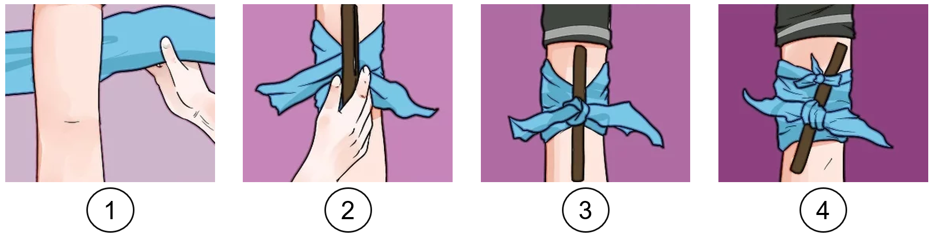 + Đặt dây garo (hoặc băng thun) và siết chặt dần đến khi máu ngừng chảy thì cố định lại dây (hoặc băng thun). Nếu không có dây garo hoặc băng thun thì có thể dùng dây vải sạch có chiều rộng khoảng 4 - 5 cm và 1 thanh gỗ hoặc thân bút bi thay thế.