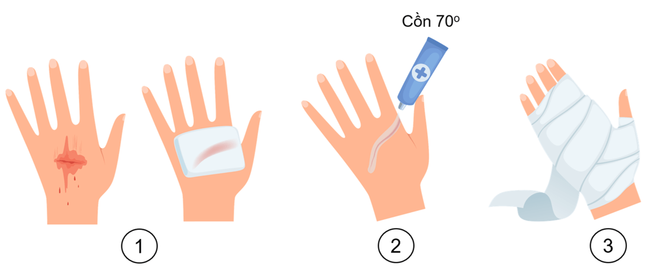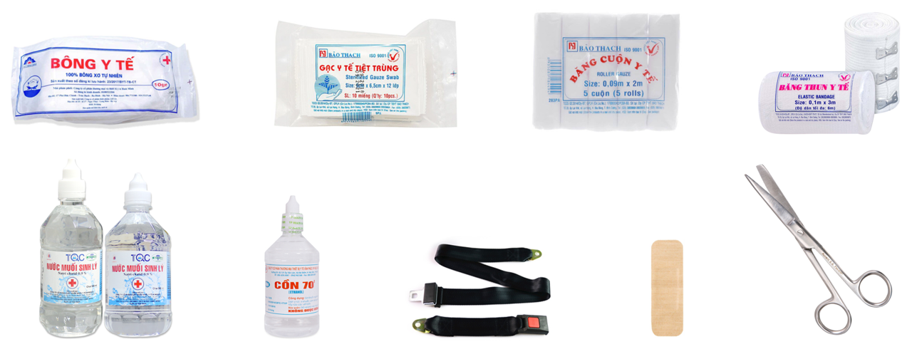 Chuẩn bị: bông, gạc, băng cuộn, băng thun (hoặc dây garo), băng dán y tế, kéo, cồn sát trùng (hoặc nước muối sinh lí).