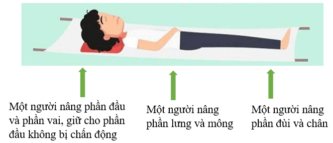 Bước 3: Gọi thêm 2 - 3 người hỗ trợ đưa người bệnh lên càng cứu thương để đi cấp cứu. Di chuyển người bệnh nhẹ nhàng, không gây chấn động, chú ý nâng đầu người bệnh cao hơn chân để làm giảm nguy cơ phần đầu bị đọng máu.