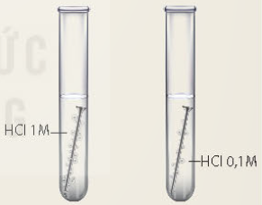 Ví dụ: Cho vào ống nghiệm (1) khoảng 5 mL dung dịch HCl 0,1 M; ống nghiệm (2) khoảng 5 mL dung dịch HCl 1 M.